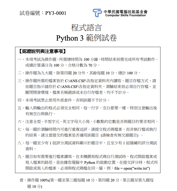 2. 操作題為第一至九類各考一題共九大題,除第四題20分外,其餘每題10分,總計100分